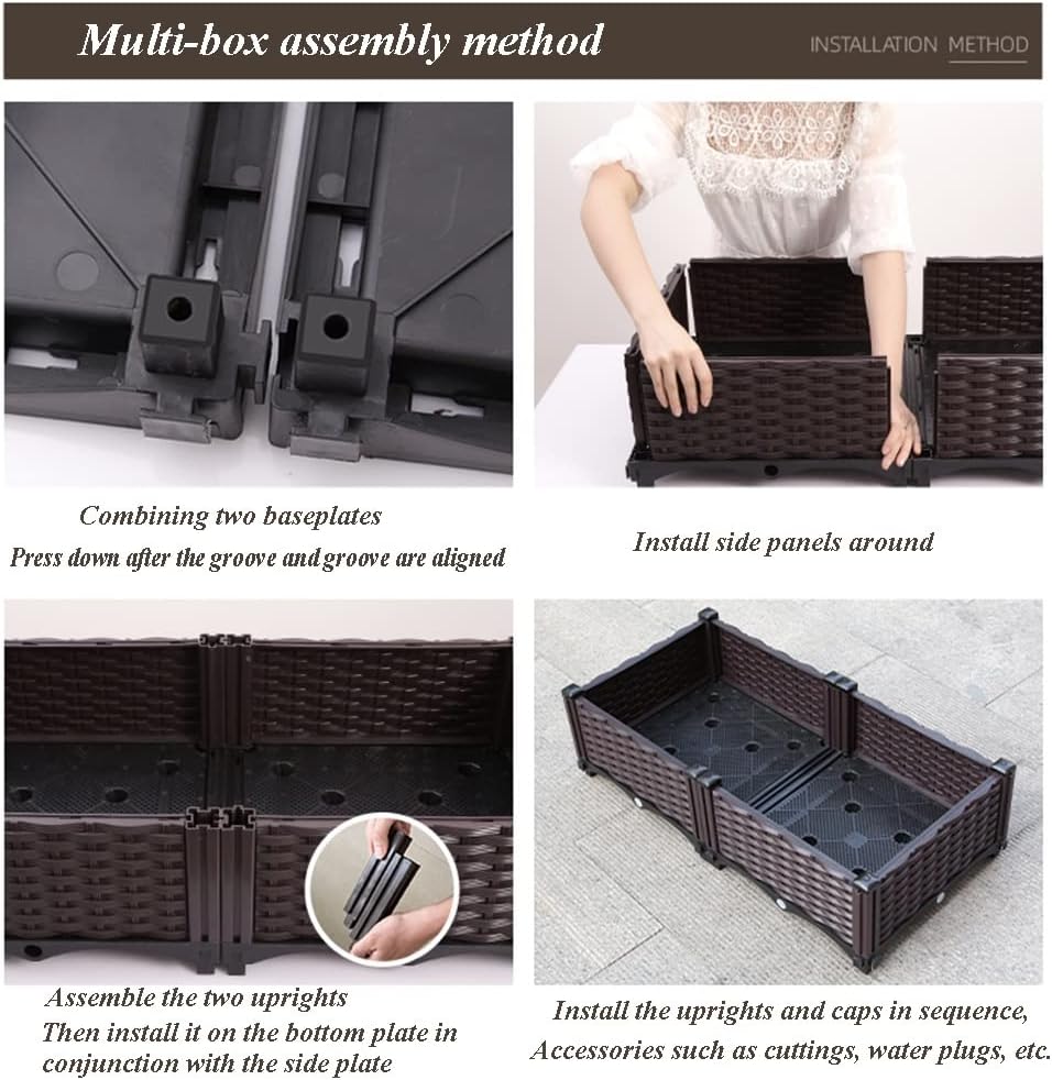 ➤ DIY FREE COMBINATION MODELING:DIY is always a great thing,give full play to your imagination,create your own dream garden,fill it with flowers for a stunning display. You can connect the brackets freely for adding height to protect your plants from rabbits and other garden pests!Elevated garden beds at such, you have enough room to grow a variety of vegetables,herbs,flowers or even houseplants.➤ STRONG AND SAFE MATERIAL:The material is food grade safe without any paint and harmful chemical, you can safely plant whatever you like!The frame is formed from tough and thick plastic to ensure lasting use outdoors, finished in a rattan-effect look so it can blend in beautifully with all your other garden furniture. ➤ PRODUCT DETAILS:Product name: Garden Raised BedMaterial: Resin PPColor: Dark coffeeSpecifications: LxWxH➤ We are committed to creating a great shopping experience for you, if you have any questions, you can communicate with us by email. We have a professional service team that responds within 24 hours.